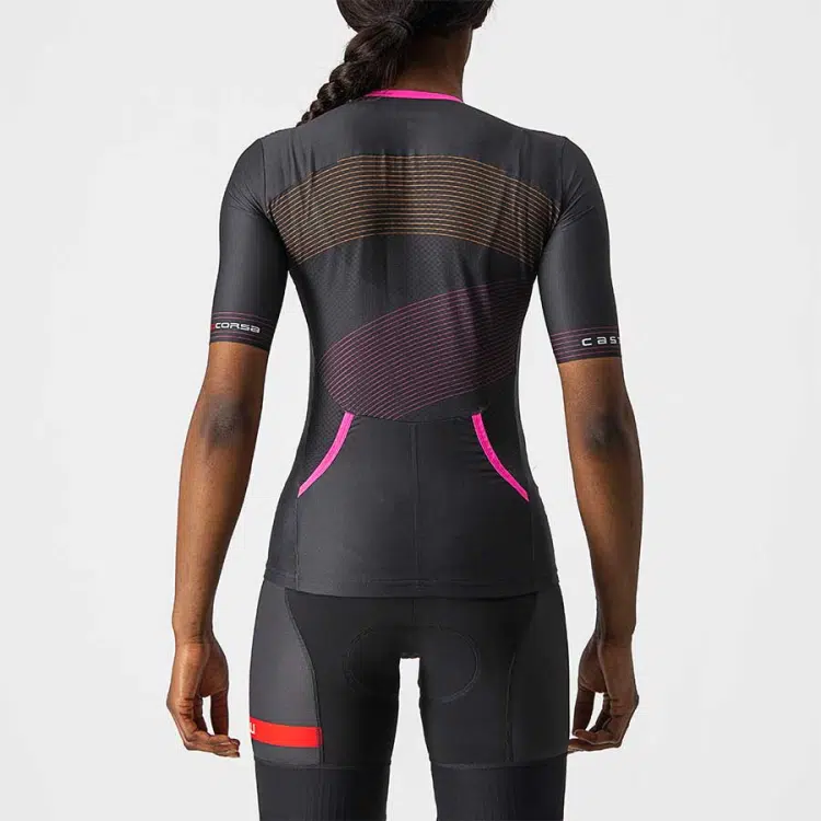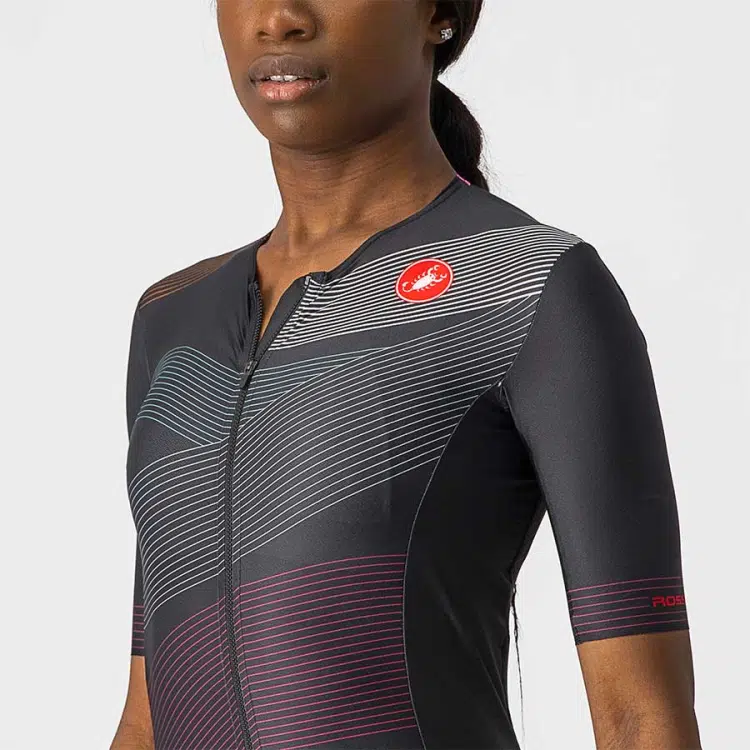 יש נשות ברזל שמעדיפות חולצה עם שרוולים בשביל האקסטרה מהירות, יש כאלו כי זה פשוט נח להם. החולצה הזו נותנת את שניהם! החולצה הכי טובה מבית קסטלי ששומרת על אווירודנמיקה במיטבה ופותחה בין השאר עם שיתופי פעולה עם האוניברסיטה הטכנית ב Trondheim נורבגיה כדי ליצור את ההתאמה המושלמת. כמה שפחות תפרים בשביל נוחות ואיכות הבד האיטלקי הרך והנעים יובילו אתכם לקטוף הישגים מהר מאד. בנוסף, החולצה חוסמת 94% מקרני UV עם בד mesh מאוורר שלא פוגע במהירות והנוחות. לא תחליף לקרם הגנה אבל הבד מעניק UPF 16 (כאשר חולצת טישרט רגילה בדרך כלל מעניקה 8). אם זה לא מספיק, החולצה מצויידת בשני כיסים אחוריים שטוחים בשביל חטיפי אנרגיה ונעילה למכנסי קסטלי בקצוות כדי למנוע מהחולצה לעלות בשחייה או ברכיבה.